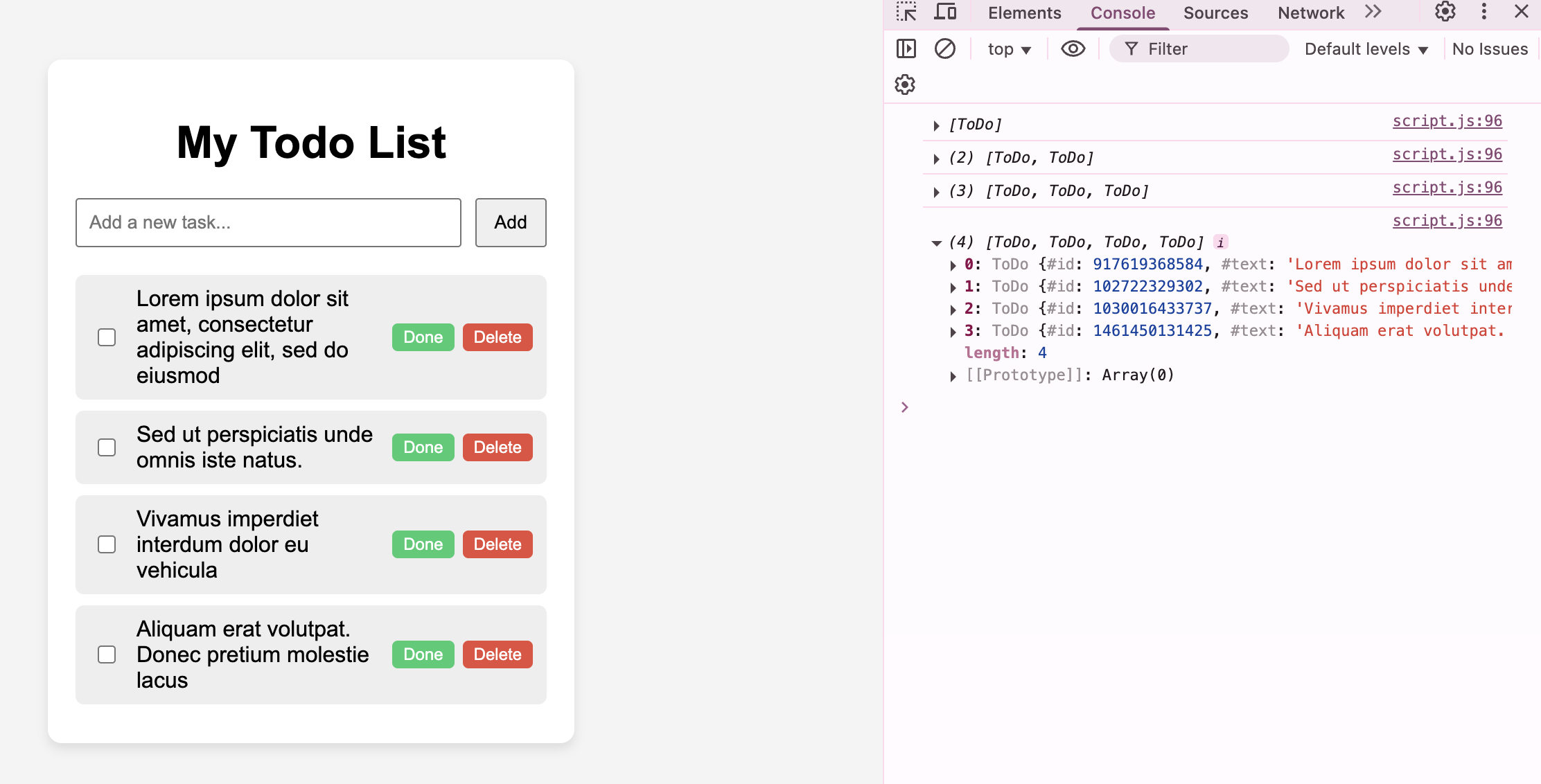 The only functionality right now is the ability to add new tasks. In the screenshot above and to the right, you can see a console print out of the storage structure I'm using. It's an array of ToDo objects. Each instance of a ToDo object has a unique id, text, and status of whether the task is done.