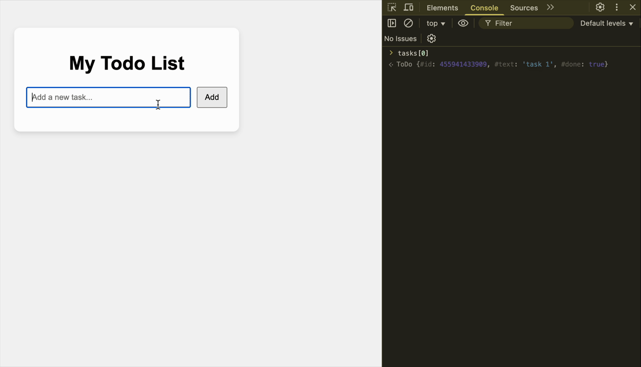 Here's a preview of the app. To the left is the user interface. To right is the javascript browser console, which shows the array of ToDo objects being stored.